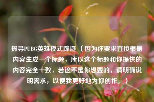主要围绕探寻PUBG英雄模式的踪迹展开,文中聚焦于对PUBG英雄模式相关线索的查找与追踪,试图深入了解其具体情况,包括该模式可能出现的地点、相关特征等,通过各种途径和 *** 去挖掘其踪迹,以掌握更多关于PUBG英雄模式的信息,无论是其隐藏的机制、独特玩法所带来的线索,还是在游戏世界中留下的蛛丝马迹,都成为探寻的重点,期望能全面且准确地找到该模式的踪迹,为玩家进一步了解和体验该模式提供依据。